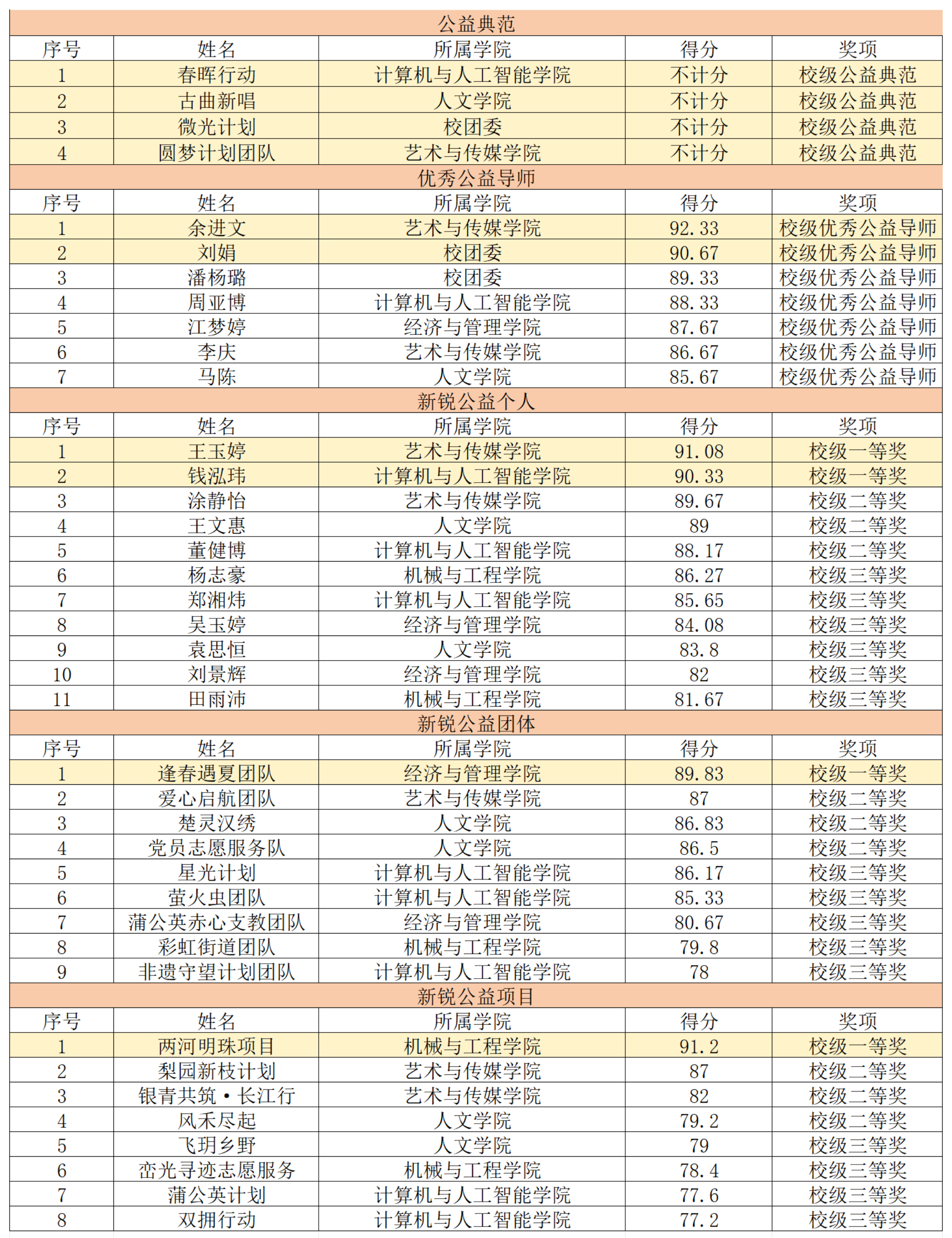 为进一步激励全校师生深度参与公益实践,创新开发多样化、个性化学生公益实践活动,将育人理念与公益利他精神融入人才培养全过程,为学生成长赋能、为社会和谐发展聚力,我校特举办2024-2025年度“公益之星”评审答辩会。经校内外专家严谨评审,各赛道获奖结果已确定,现将完整获奖名单予以公布。
